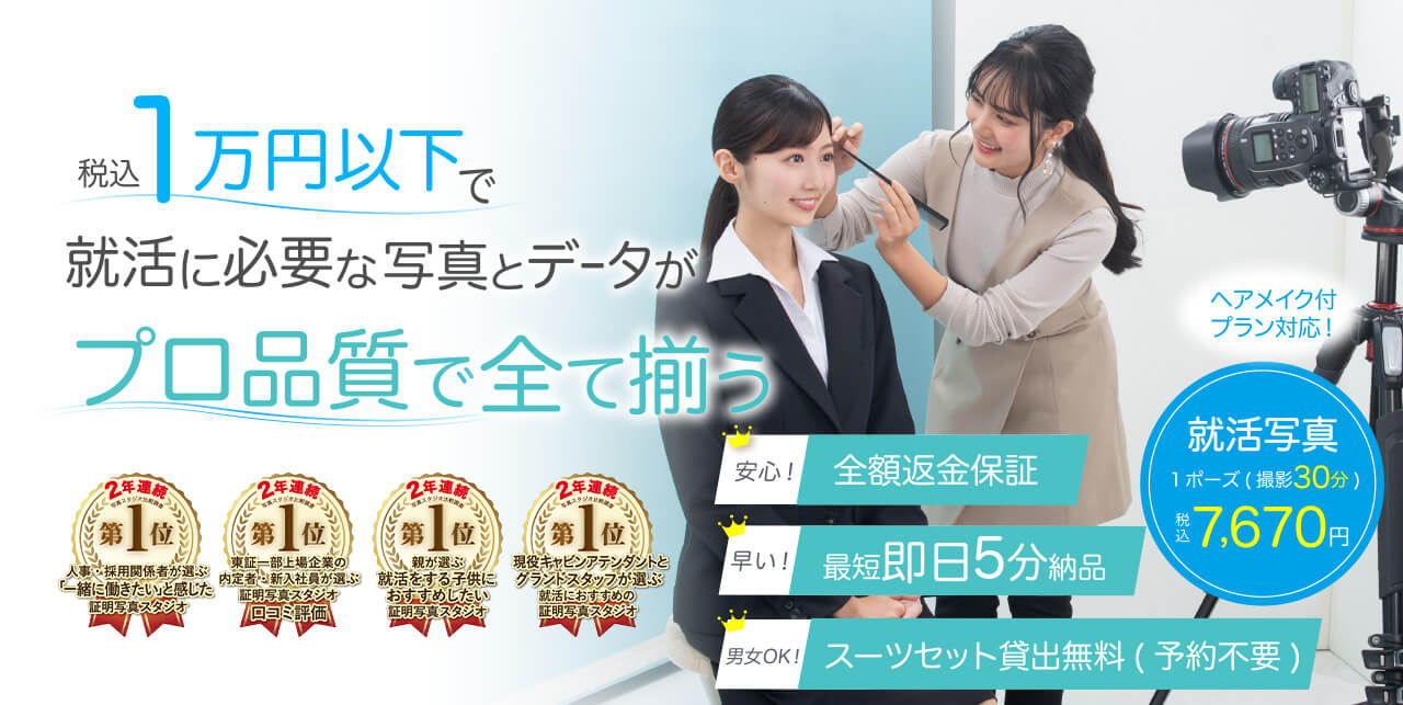 就活・転職・インターン用の証明写真の撮影に特化した写真スタジオです。当日予約歓迎、ヘアメイク対応、即日最短5分納品、撮影データ・スーツセット貸出は無料です。全国に14店のスタジオがあり、web完結で簡単に撮影の予約やキャンセルが行えます。